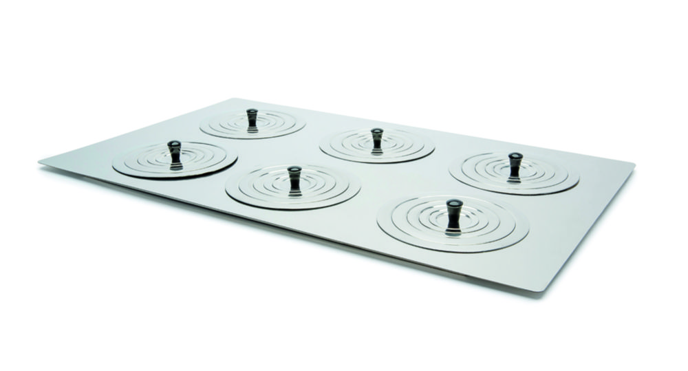Flat lid for unstirred water baths. With ring sets of variable hole diameter to accommodate tall vessels whilst reducing evaporation.