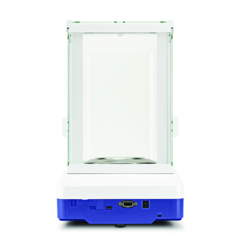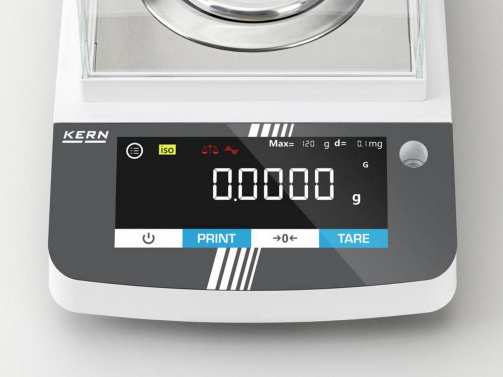 Analytical balance with flexible functionality and touch display for use in the pharmaceutical industry as well as other fields. Data query and remote control of the balance is carried out via computer or CRM/ERP systems using the KERN Communication Protocol.