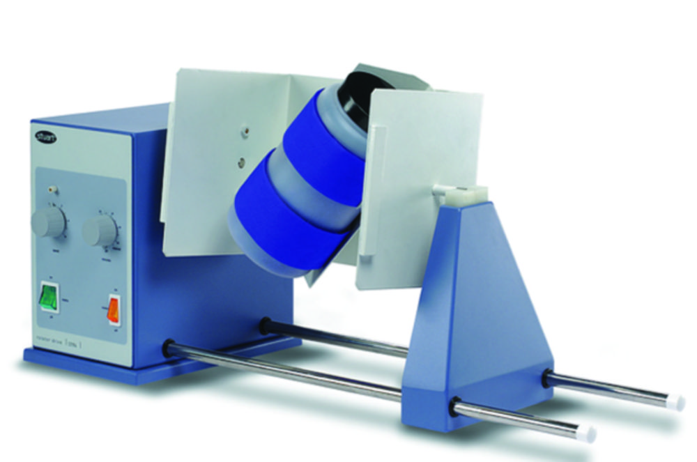 The drum has a platform which can be adjusted within the drum from horizontal to 45°. In this way, the sample container can be rolled and turned end over end at the same time (figure-8 motion). Suitable for extractions, paint mixing, powders and granular samples. The sample container is held by an adjustable velcro strap.
