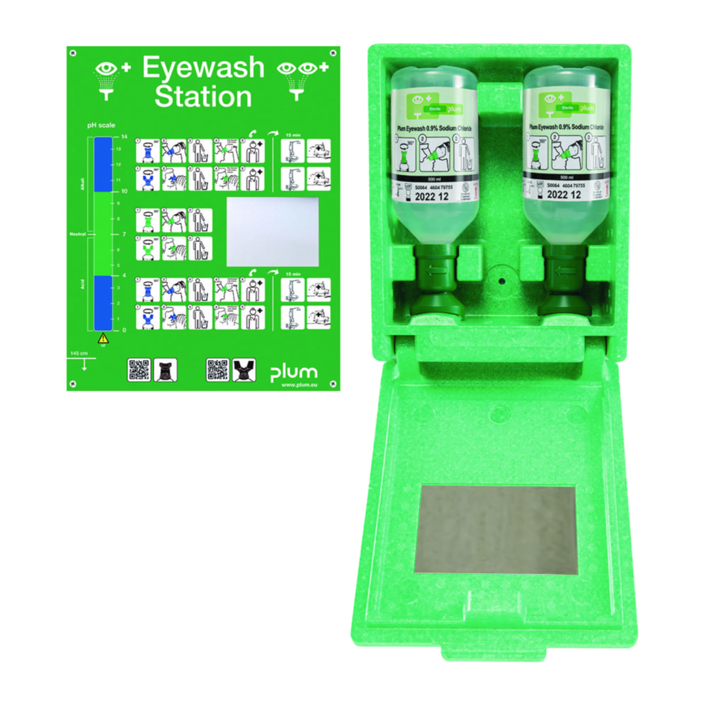 Eye wash station in dust-protected wall box. With two eye wash bottles containing 500 ml sterile sodium chloride solution (0.9%), integrated pictogram and mirror. Particularly suitable for use in workplaces where dust and dirt accumulate .