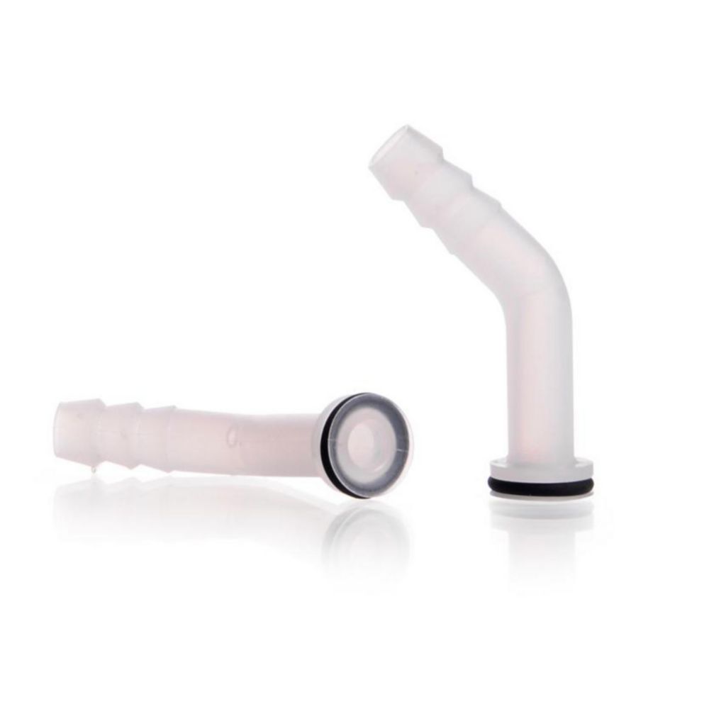 Fluoroplastics, for tubing connection. Straight and curved models available, screw connector caps made of PPS reinforced with glass fibre (max. 250°C), ferrules made of PFA, with flexible PFA sealing rim and FPM O-ring. When in use, the contents only comes into contact with PFA (or PTFE - GL25 and GL32).