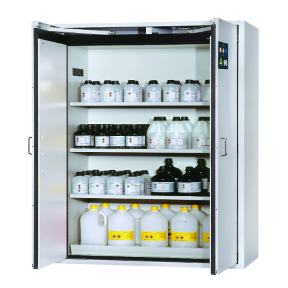 Supplied with: Safety Storage Cabinet S-CLASSIC-90 Model S90.196.120.WDAS or S90.196.060.WDAS incl. interior equipment with 3 shelves, bottom collecting sump with perforated insert