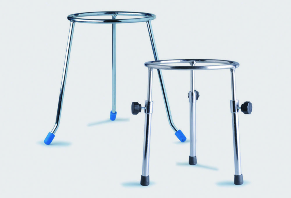 Chrome plated steel. Tripods are meant to be used in conjunction with wire gauze, triangles or a sand bath. Holding ring with 150 mm diameter can be reduced to 125 mm with the supplied reducement attachment. Adjustable height from 200 up to 300 mm.